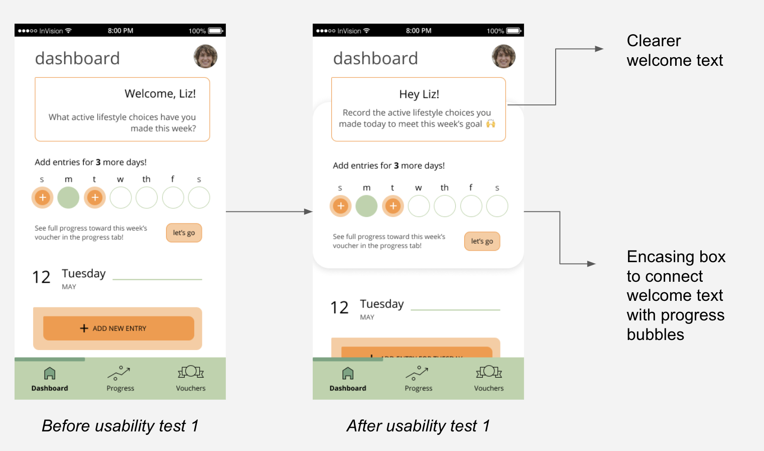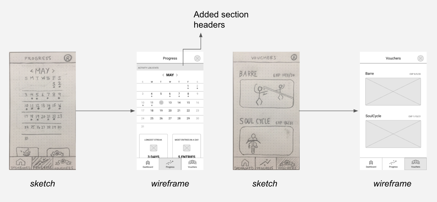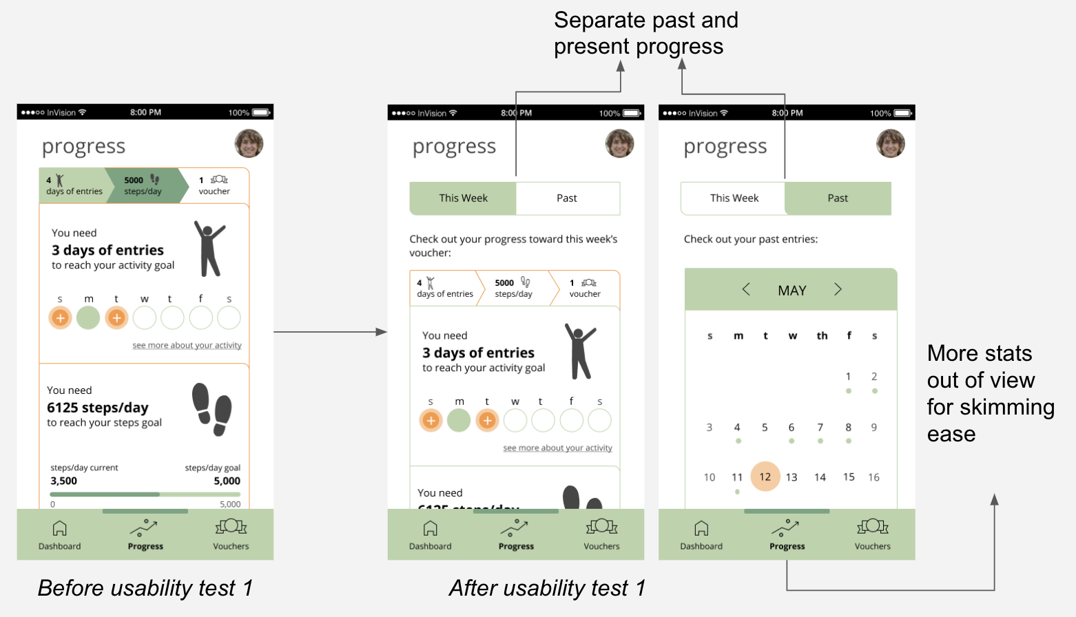 The features on the progress tab were too disparate that they did not fit into the same mental model that the participants had about what they would find on that page. This is a similar issue found during guerrilla usability testing of the initial sketches. I had added headers to impose more structure, but this round of usability testing revealed that the main source of confusion was that users experienced two kinds of progress in this app - progress towards the present week’s goal, and past progress that showed their habits and growth.