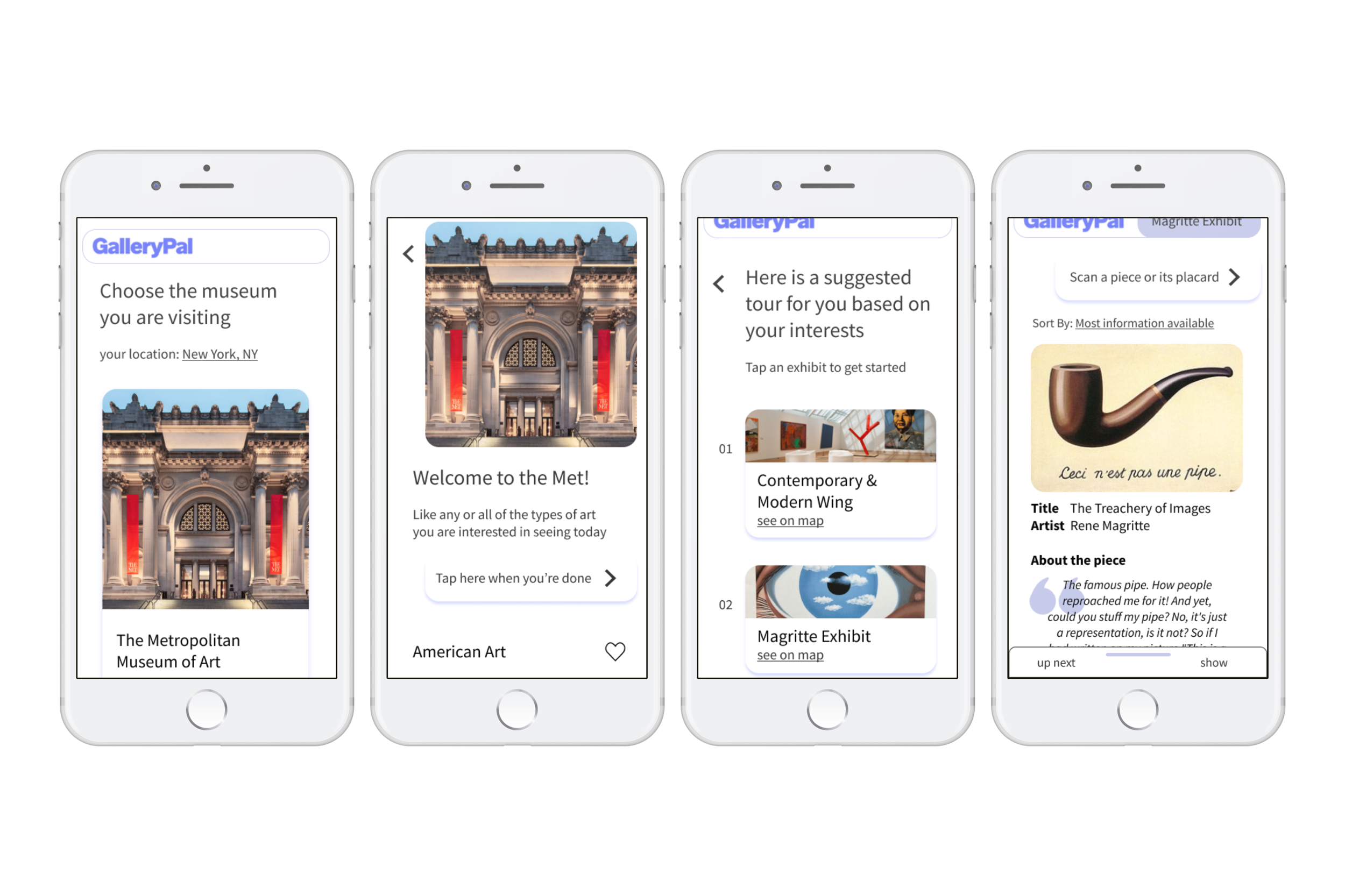 I created a mobile app called GalleryPal which serves as a companion app for museum visitors. Visitors can indicate the styles of art they are interested in for a semi-personalized tour, and each wing of the museum contains pages for individual pieces where they can read concise information about the art.